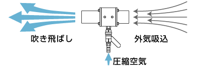 外気を吸い込みながら吹き飛ばすので、圧縮空気に対して数倍の力で吹き飛ばす事ができます。