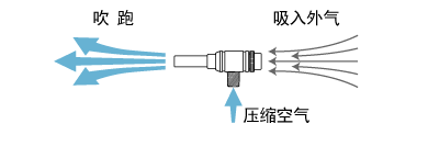 吸嘴向前方安装:当压缩空气接近管嘴时,向A方向发生螺旋形喷射,促使B方向引入大量的外气的同时与压缩空气混合后发生强力的吹飞功能。